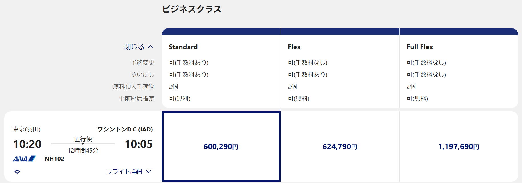 羽田空港からダレス国際空港までのビジネスクラス料金は