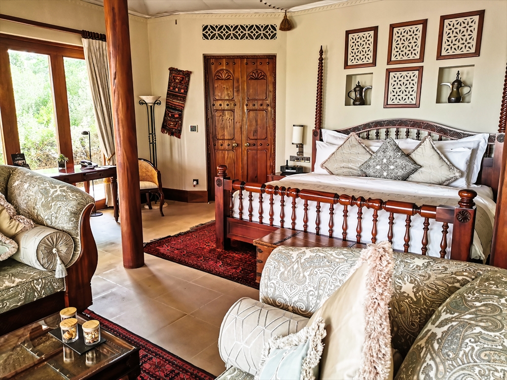 豪華な木製家具が配置され、エキゾチックでありながら落ち着いた大人の雰囲気が漂っています。