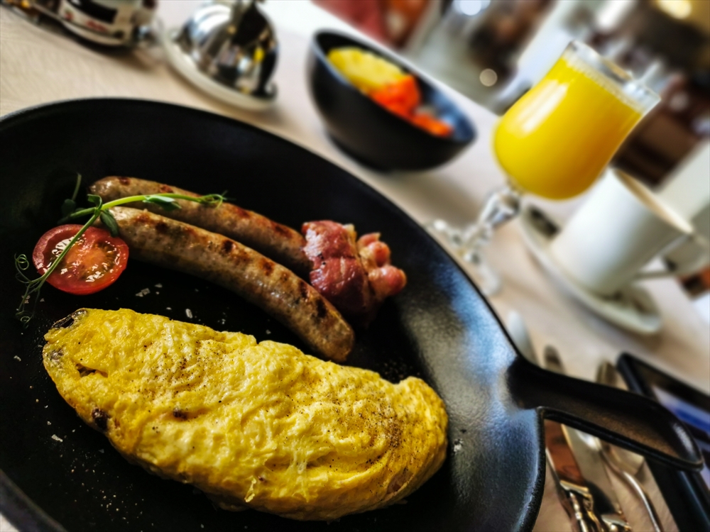 ふっくらとしたオムレツと、香ばしく焼かれたソーセージ、